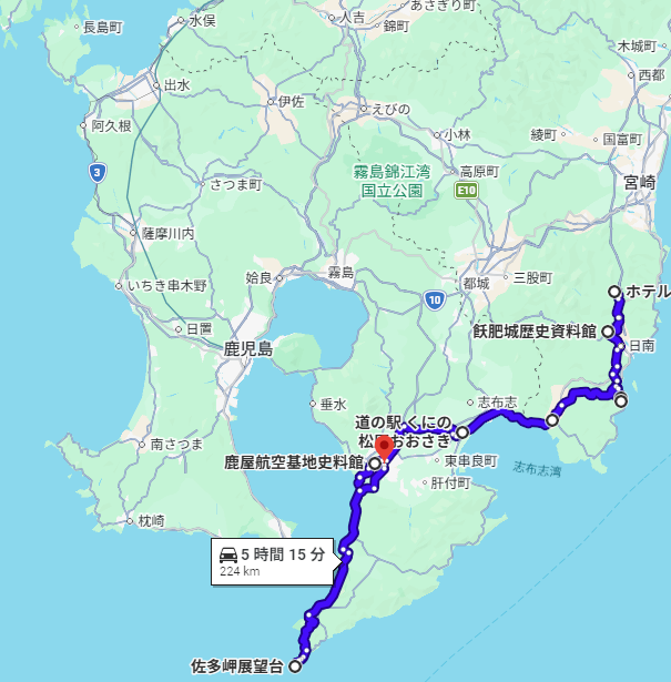 全体ルートからDay3の箇所を抽出したのが下記になります。北郷を出発し、本土最南端の佐多岬を訪問します。