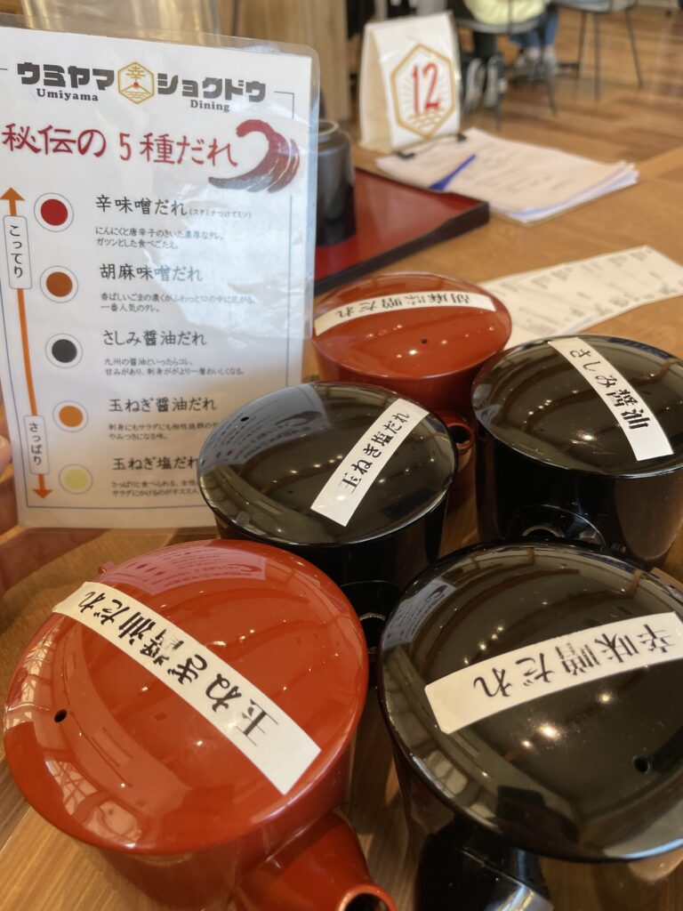 5種類のたれが併せて運ばれてくるので、好きなものをかけて食べます。ぶり丼の切り身の下には野菜もサラダのように隠れているので、意外とドレッシング風味のたれも合いました。