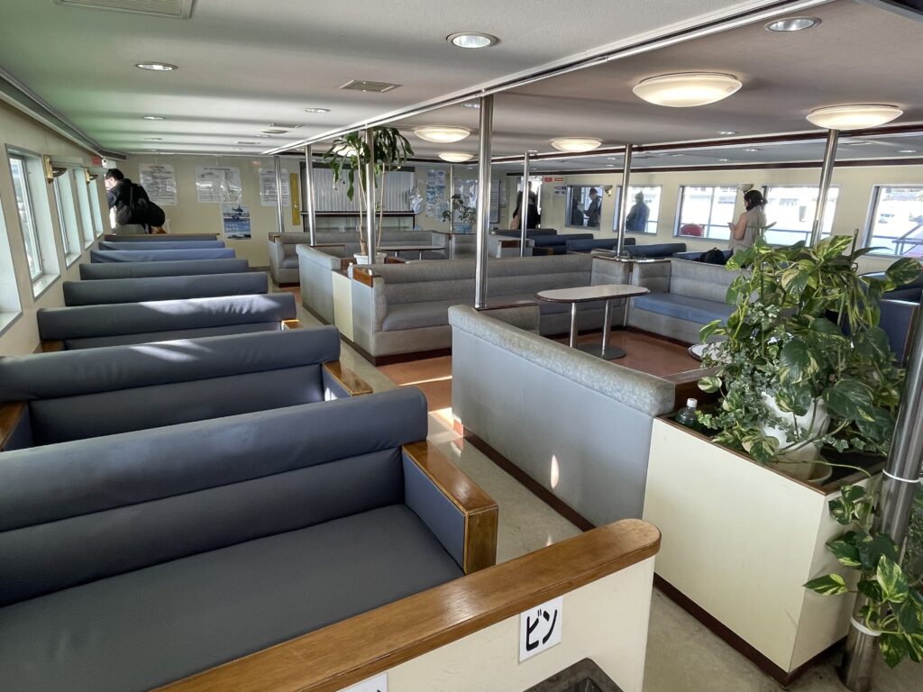 船内には、青系の色を基調としたクロスシートのソファーが配置されています。