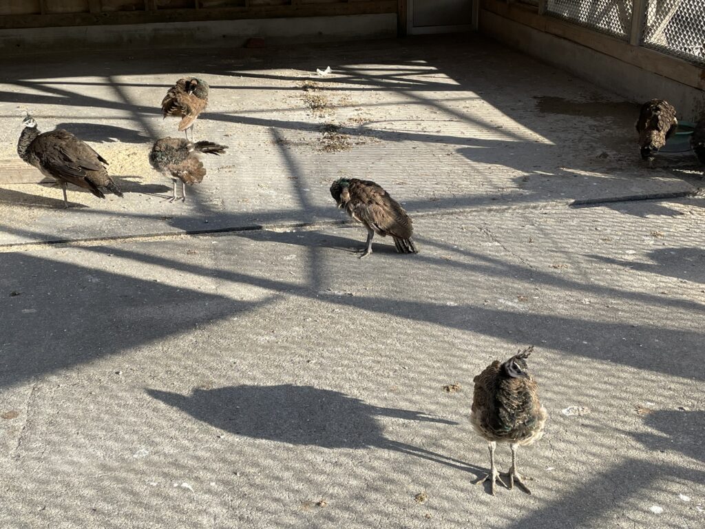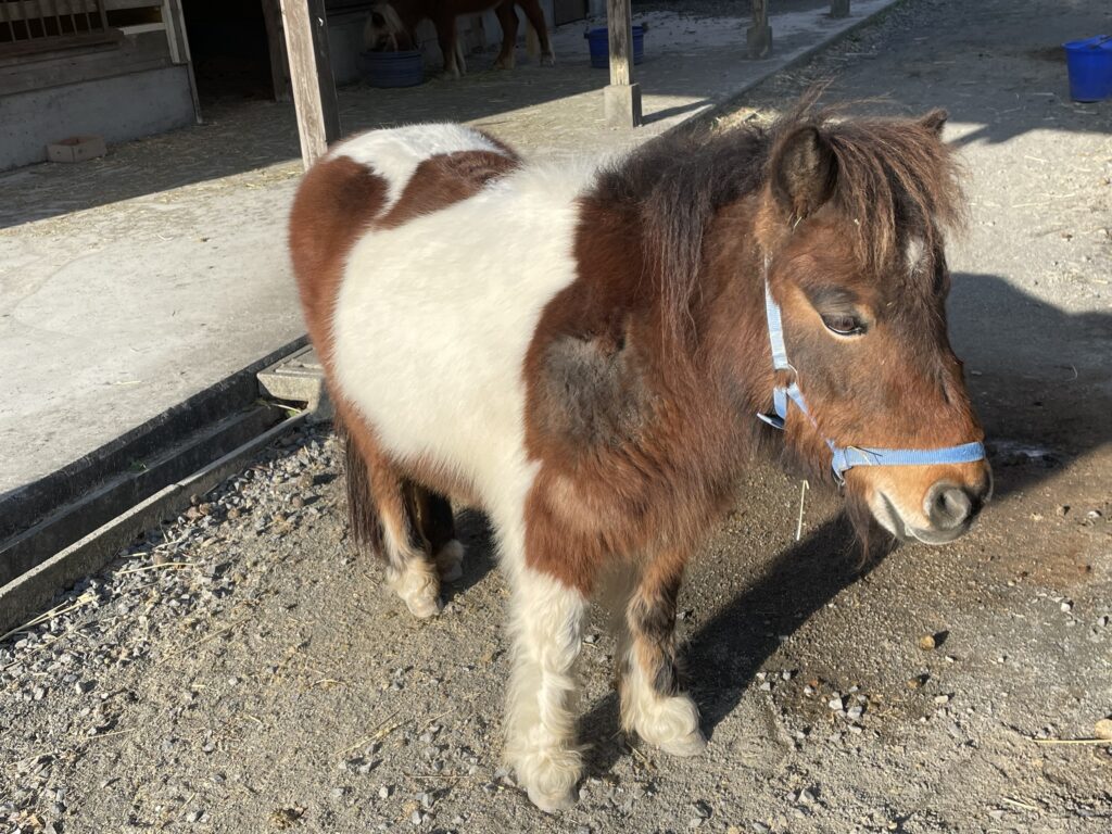 クジャクの他にも動物がいます。こちらはポニーです。先日見た天然記念物のトカラ馬の大きさそのままの可愛さです。ただ、非常に大人しいトカラ馬と異なり、人の持っているものにとても興味を持って近寄ってきます。